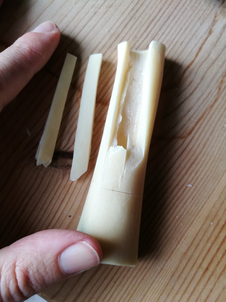- Decide how large a needle you wish to make and start by creating a blank larger than you intend the finished needle to be – you can’t add bone later. Select a portion of the bone which is relatively straight, smooth, and free of butchery marks or artery holes (the nutrient foramen) and pencil in your blank.