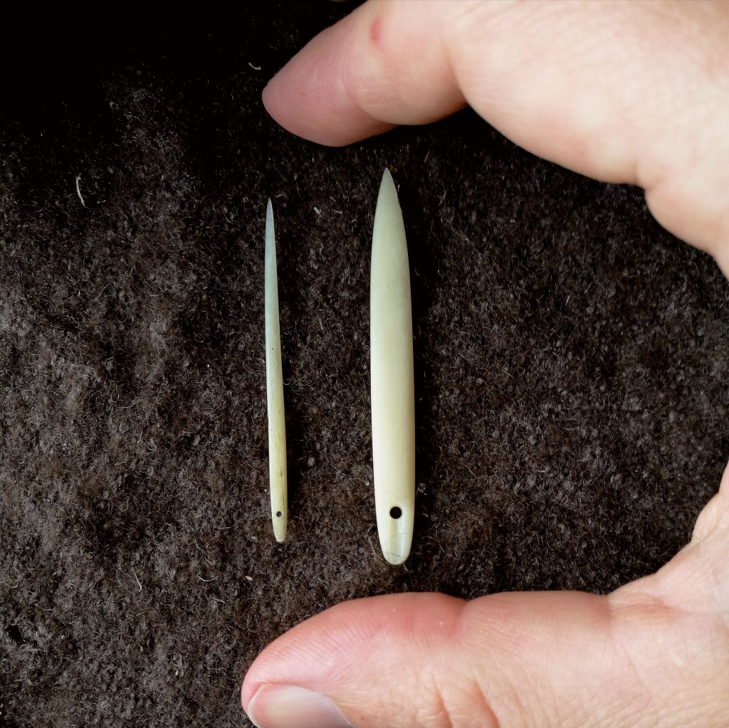 Horn, antler, and bone – including bird bone – is fine enough to create a tool that is smooth and slender so as not to punch great holes into the material being sewn, but flexible enough so as not to be brittle.