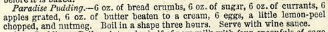 Paradise Pudding Ingredients. — 3 eggs, 3 apples, ¼ lb. breadcrumbs, 3 oz. sugar, 3 oz. currants, salt and grated nutmeg to taste, the rind of ½ lemon, ½ wineglassful brandy.