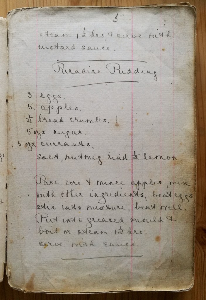 All this serves as a talking point for recipe #5 in The Cookbook. What happened to 3-4, I hear you cry? Good question. That page is missing. Perhaps the original writer made an error she didn’t want to preserve, or perhaps it fell out years ago and found its way to the bin rather than back into the collection. All we know of recipe #4, from the part of it that slipped onto page 5, is that it was another boiled pudding, served with custard. My kind of pudding.